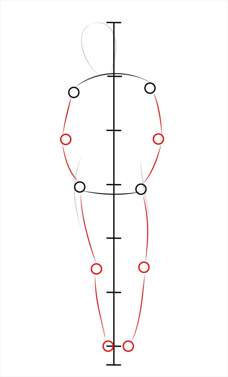 Това са сдвоени точки. Можете да ги свържете с една линия - дясното рамо с лявото рамо, единият лакът с другия. Чрез начертаване на линии под прав ъгъл и преместването им нагоре и надолу или надясно и наляво спрямо главната координатна ос не е трудно да се коригира положението на ключови точки и на целия силует.