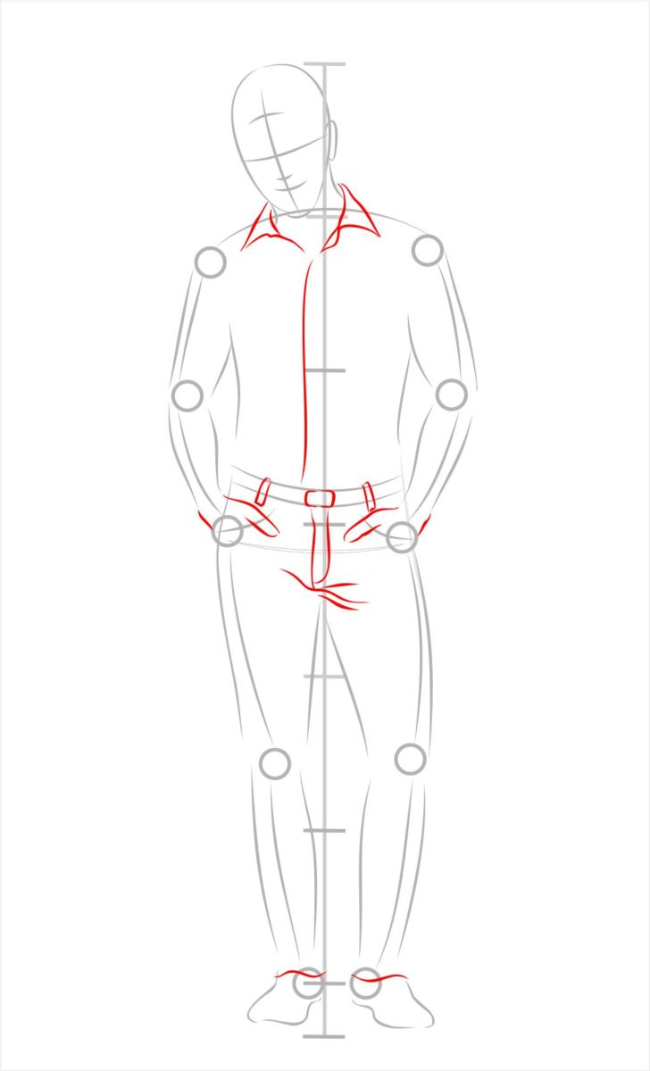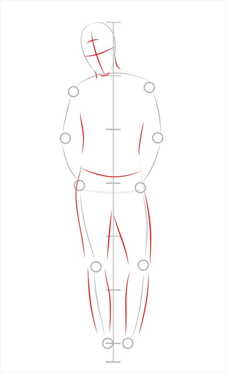 След това по координатната ос трябва да нарисувате бедрата. Те трябва да са широки колкото раменете, малко по-малки. Горната част на краката заема следващия сектор и още една половина, а коленете трябва да се нарисуват във втората му половина. След това трябва да се начертаят пищялите на краката, а стъпалата - два трапеца.