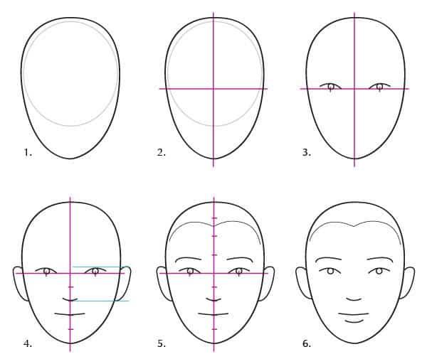 Той е изобразен като овален, леко стесняващ се към дъното, със заострен край. Вертикалната ос трябва да минава по средата и да разделя овала на две. Ушите трябва да са приблизително в средата на главата, малко по-близо до брадичката.