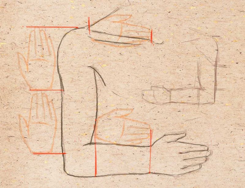 В близост до него палецът се рисува с още две дъги, така че ръката да наподобява овал. Удобно е също така да нарисувате дланите като овал, разширяващ се към долната част, свити в юмрук.