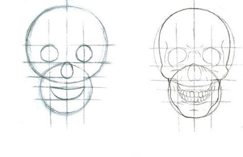 За майсторите, които нямат художествен опит или са слабо запознати с анатомичните препарати, може да се използва лист от тетрадка, обикновен молив или химикалка. Инструкции как да нарисувате череп стъпка по стъпка: