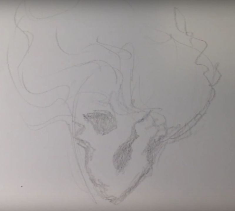 - От ъгъла на очната ябълка прокарайте плавна линия до противоположната орбита, която трябва да минава през точката на брадичката. В тази област се изобразяват челюстта и носната кухина.