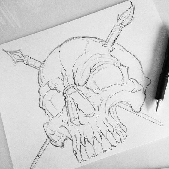 - Малко по-настрани, отново водете молива надолу, успоредно на първата лента. По този начин художникът получава две остриета на мечове, стърчащи зад черепа.
