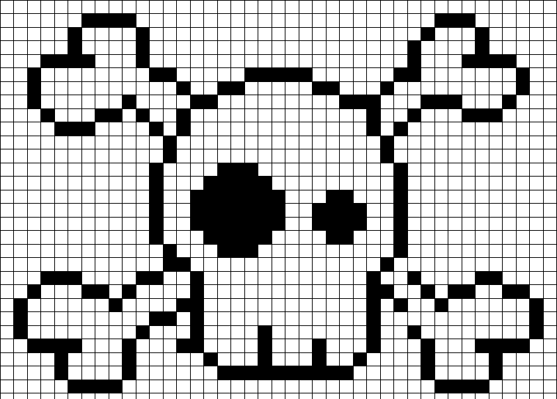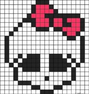 - Краищата на вертикалните линии се съединяват в полукръг. Още първият ред е разделен на три части, имитиращи челюстта на черепа.