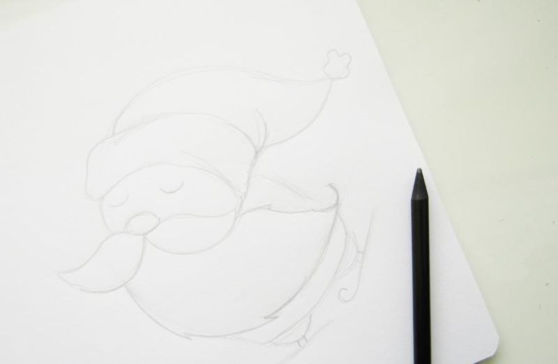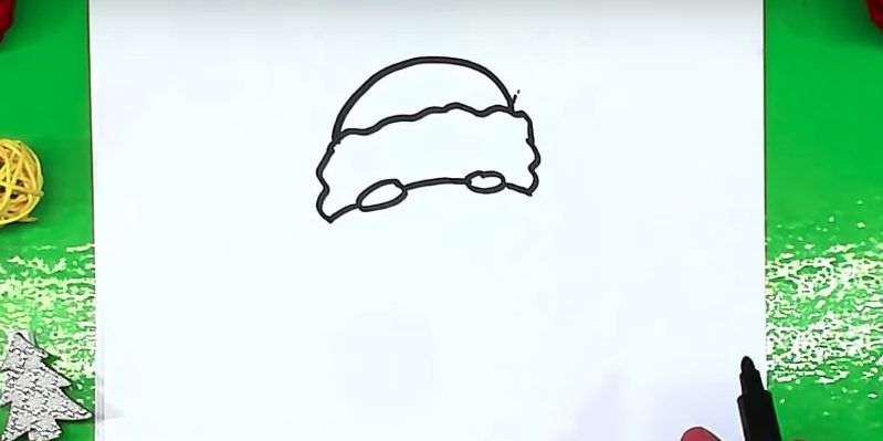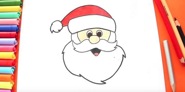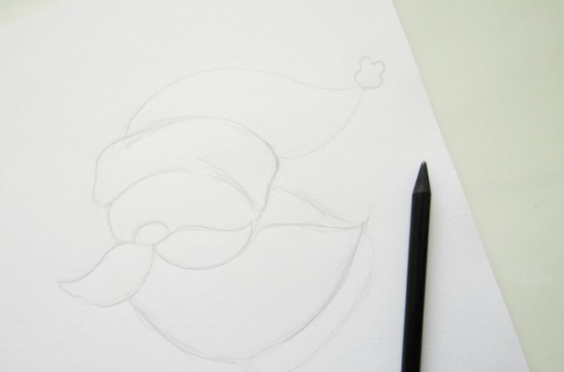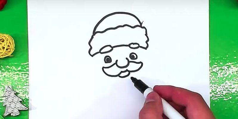 - Оформете линиите на кръглото лице и го допълнете с коледна шапка с голям помпон. Не забравяйте да маркирате бялата ивица кожа!