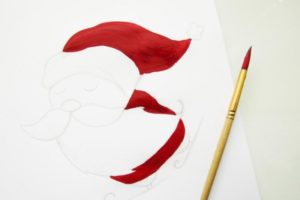 - Боядисайте коледната шапка също в ярко червено, а помпона, кожената лента, веждите и брадата оставете бели. Нашият красив портрет на Дядо Коледа е готов!