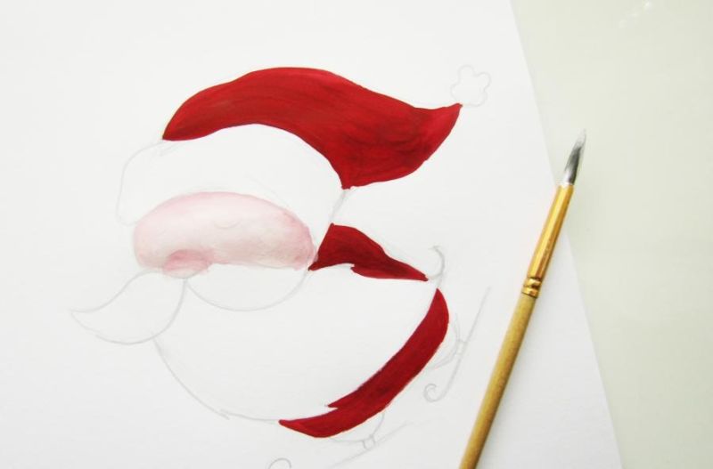 - Смесете бял гваш и малко жълто на палитрата, след което със средна четка нарисувайте овално лице в центъра на фона. Над лицето нарисувайте с бял гваш ивица козина върху шапката и след това завършете шапката с червен цвят. Шапката е заострена към края, не забравяйте да добавите хубав бял помпон!