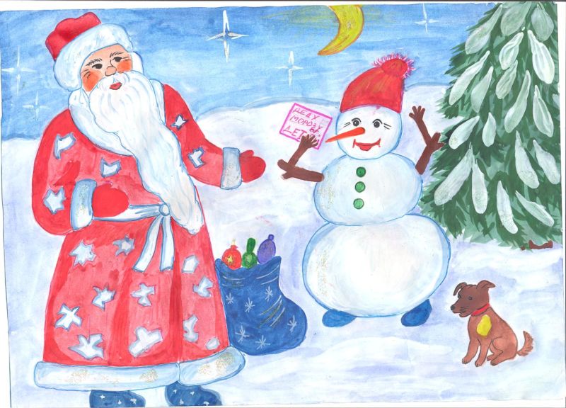 - Ако желаете, можете да добавите лек сняг с бял гваш върху синия фон, за да завършите картината. По този начин рисунката ви ще придобие зимно, приказно настроение и новогодишни мотиви! Рисунката с гваш на Дядо Коледа вече е готова! Сега можете да се уверите, че рисуването на Дядо Коледа с гваш е лесно за всеки начинаещ - ученик или дете в предучилищна възраст.