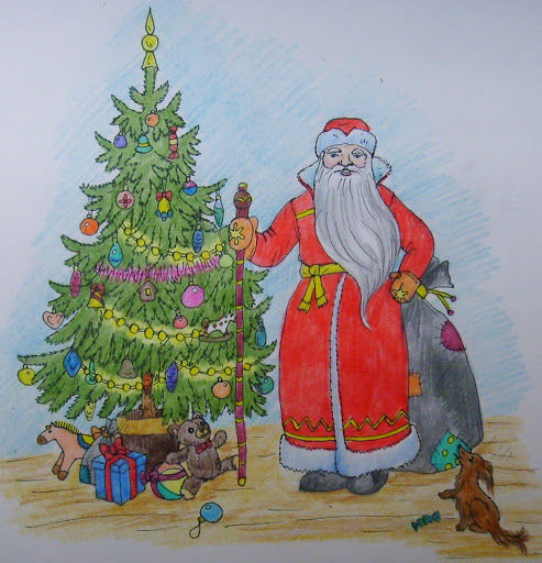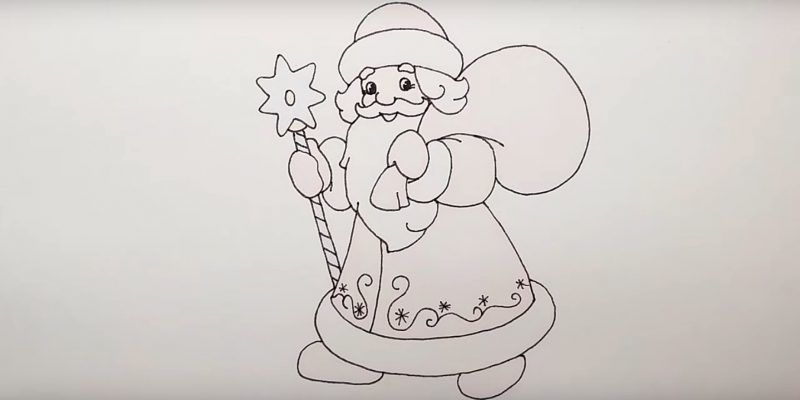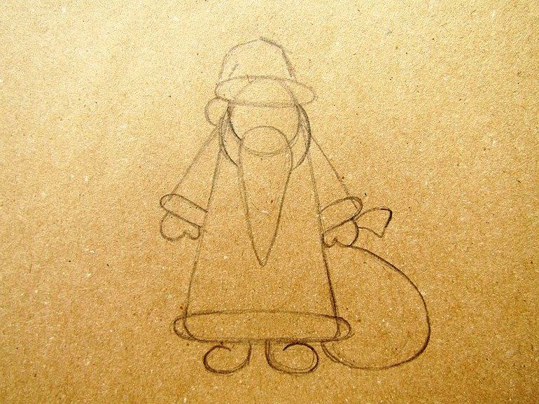 - В дясната си ръка дядо ще държи въжето от величествената шейна. Нарисувайте ги с въртеливи движения и леко наклонен гръб.