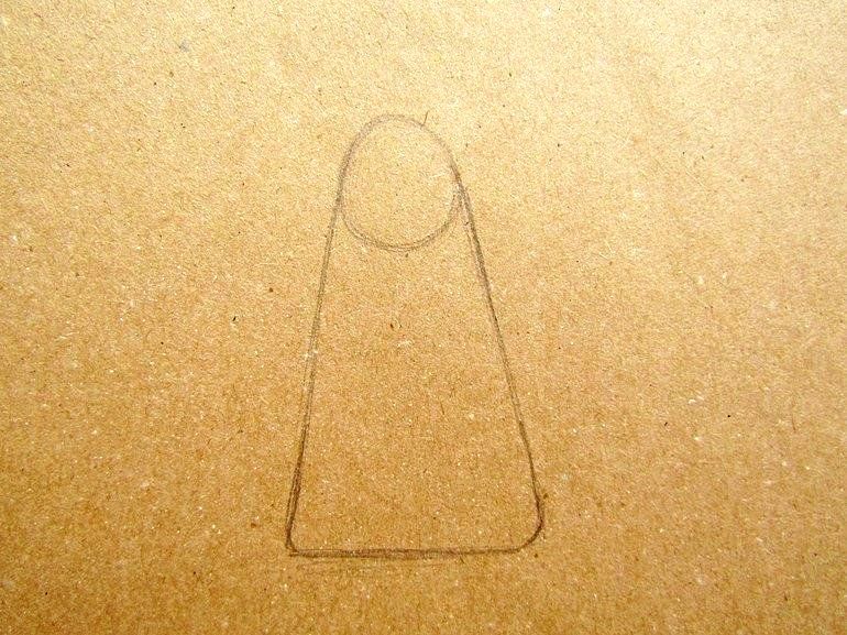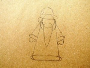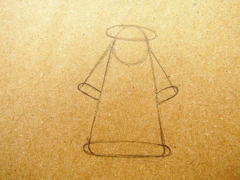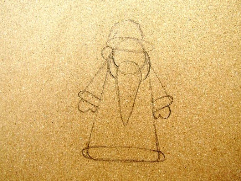 - Облечете героя в дълго палто: очертайте широки ръкави от двете страни на ръцете, нарисувайте странични граници покрай торса и краката. Допълнете силуета с масивни филцови ботуши.