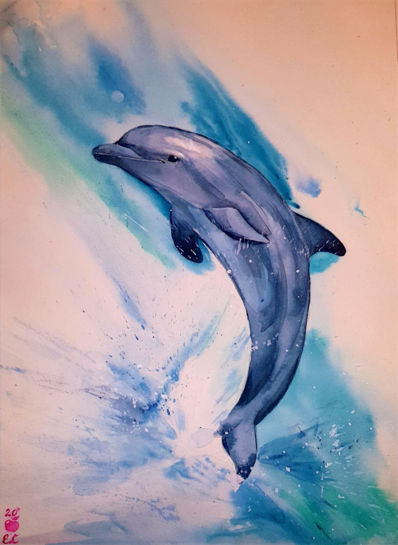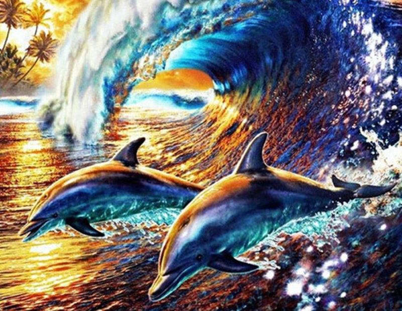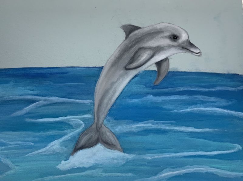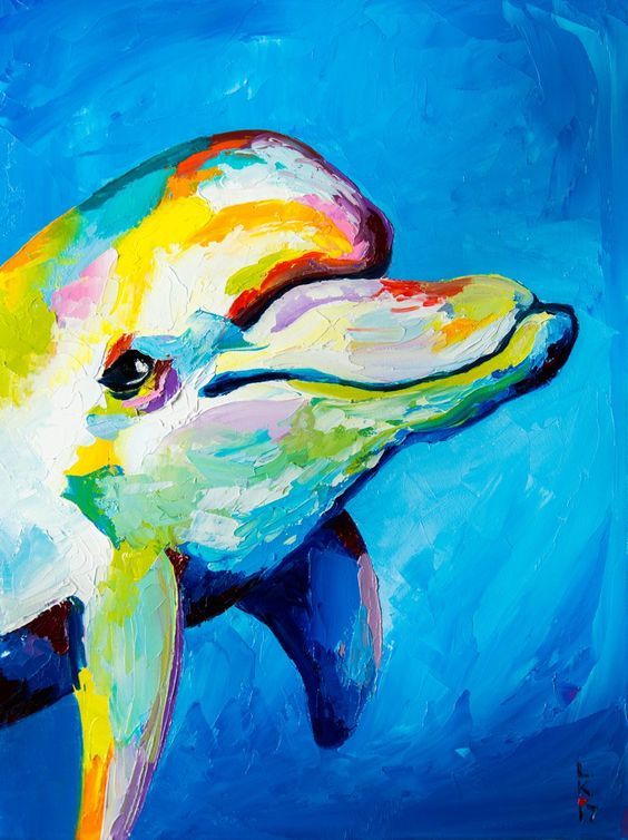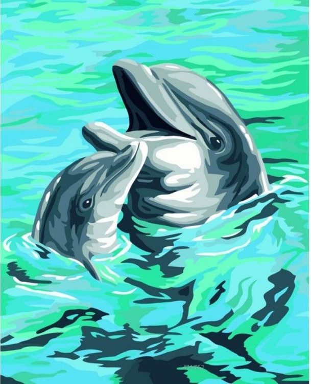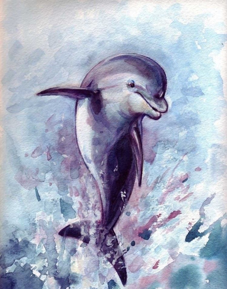 Нарисувайте с боя и делфините, като използвате тънка или средна четка. Започнете с комбиниране на черно, бяло и синьо. И направете силует на животното (който прилича на петно). От него се очертават носът и перките. След това добавяме белило към използвания цвят.