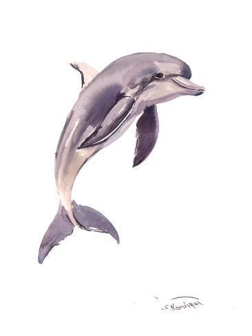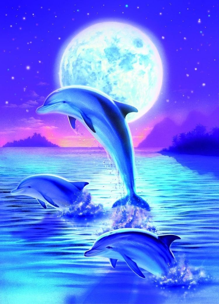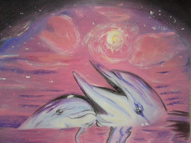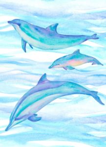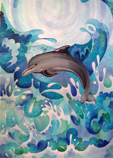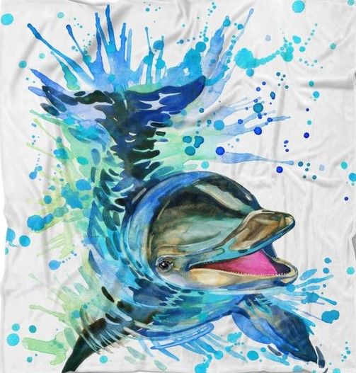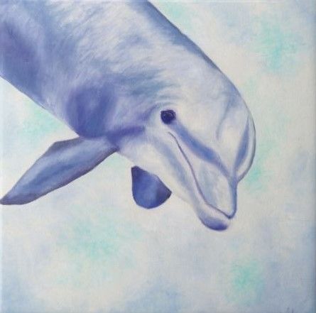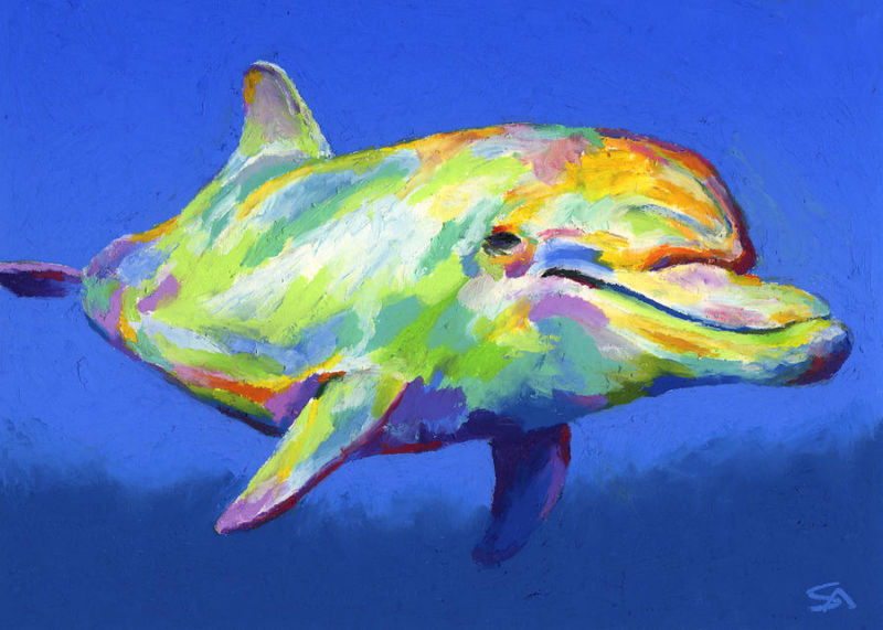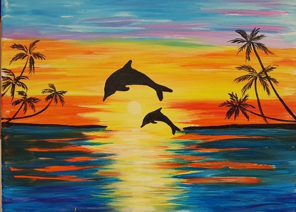 Нарисувайте с боя и делфините, като използвате тънка или средна четка. Започнете с комбиниране на черно, бяло и синьо. И направете силует на животното (който прилича на петно). От него се очертават носът и перките. След това добавяме белило към използвания цвят.