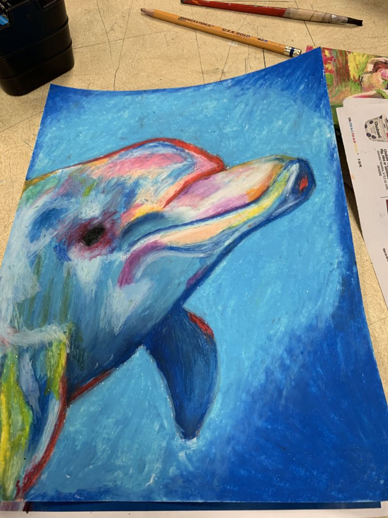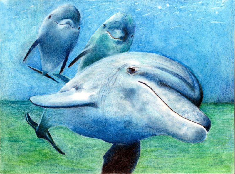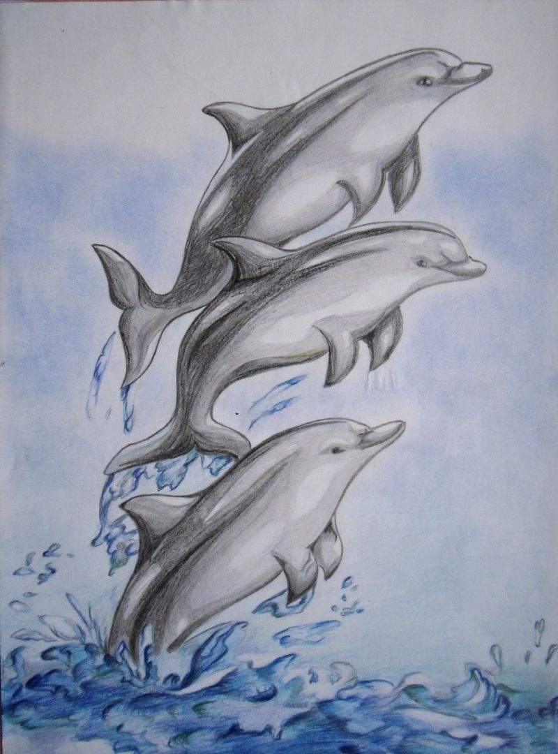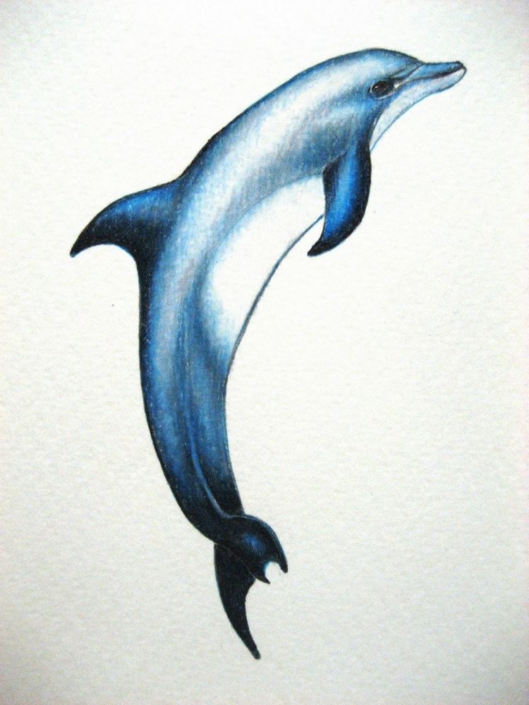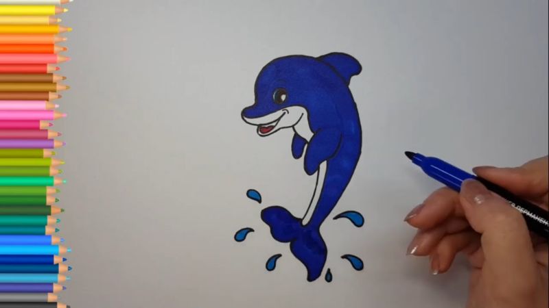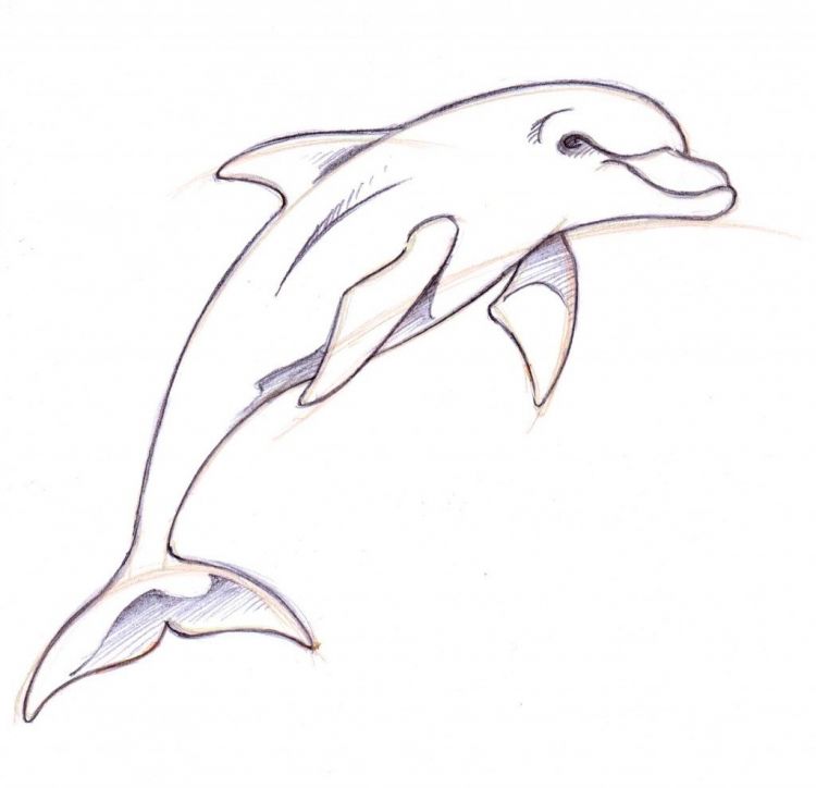 За целта изобразете горната перка, която по форма не трябва да се различава значително от другите две долни части на тялото. След това можете да нарисувате делфина с всякакъв вид канцеларски материали.