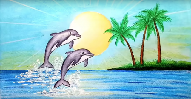 Продължете с делфините, които на тази снимка са три. Съвет! Първият може да бъде поставен по-близо до слънцето, вторият - над вълната, а третият - в дъното на вълната. Всичко е по избор, можете да изобразите едно животно или няколко бозайника, които се издигат над вълната.
