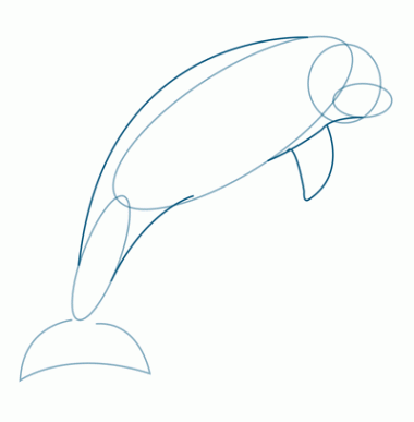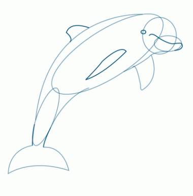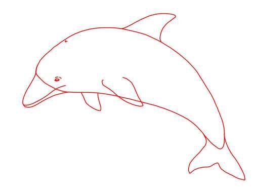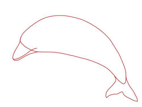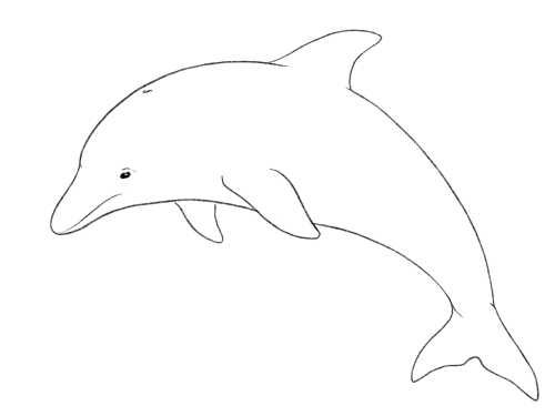 След това проследете втората линия отдолу, като направите извивка за устата под носа и проследите друга перка до тази, нарисувана по-горе. Основната част на чертежа е готова. Остава само да нарисувате горния плавник на гърба на делфина някъде по средата. И привлечете погледа на животното.
