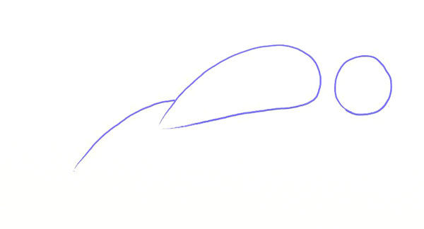 След това нарисувайте овала на главата и проследете две извити линии от частта на главата: едната в горната част на скицата, а другата - в долната. Свържете тези линии в опашната част, като изобразите опашката като двойка свързани венчелистчета.