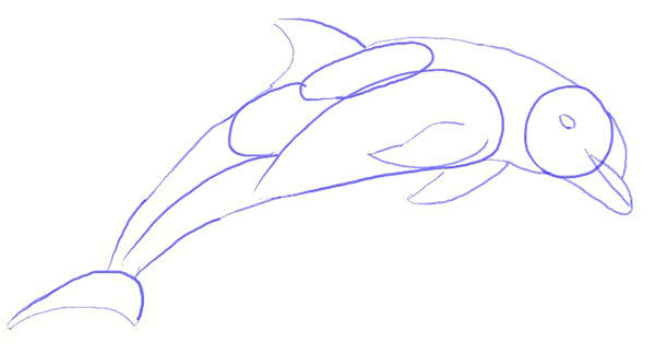 След това начертаваме линия в средата на животното. Тя ще бъде разделителна връзка между горната и долната част на делфина. В горната половина, по-близо до носа, е изобразено малко око в кръг.