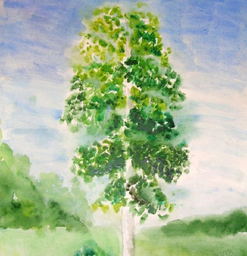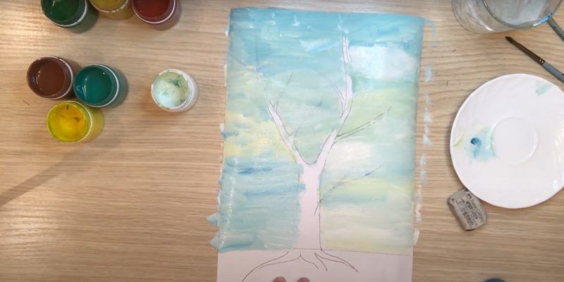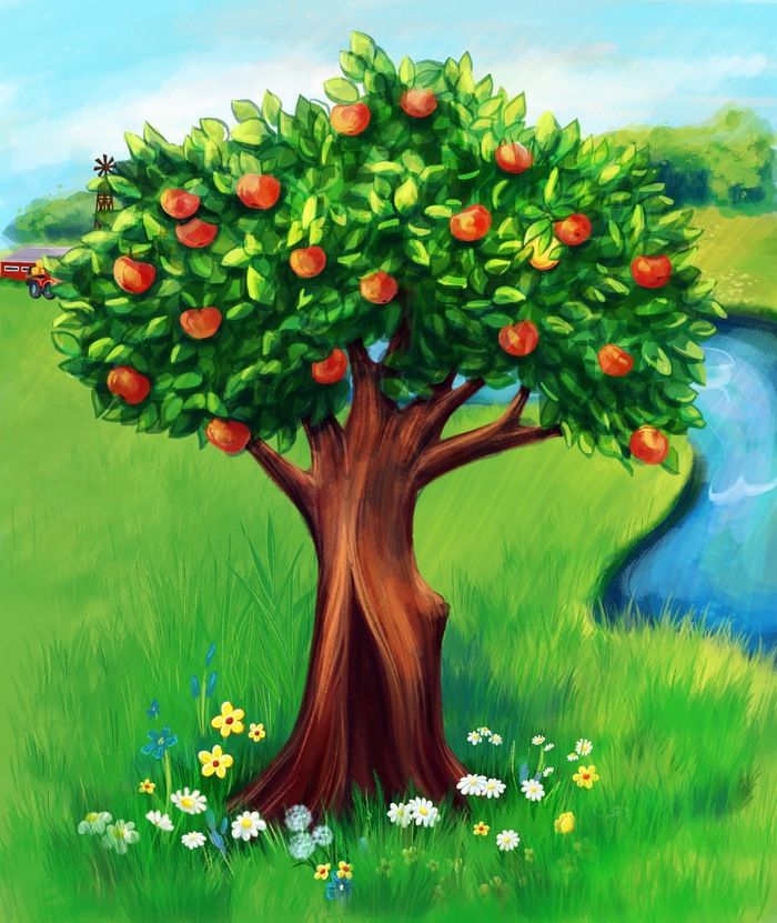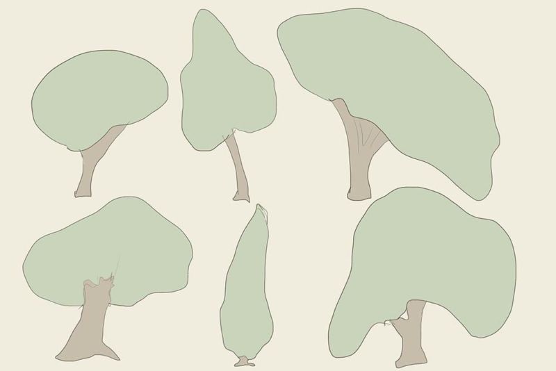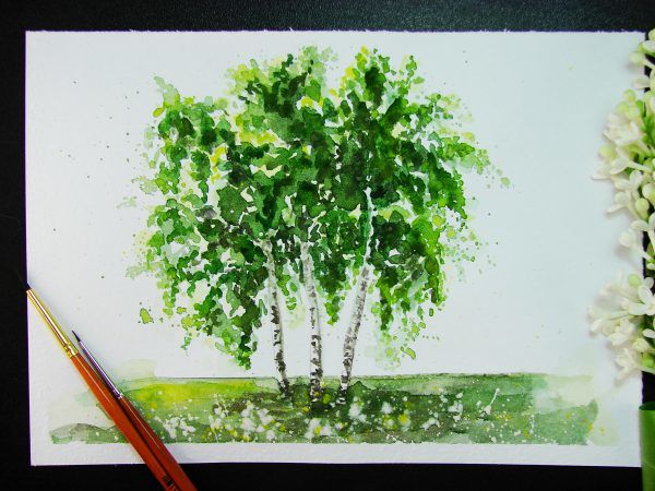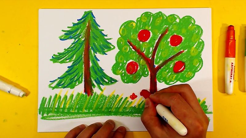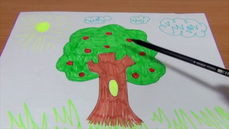 - Както и в предишните версии, под дървото можете да посочите земята, наблизо можете да изобразите водата, а с леки сенки - небето.