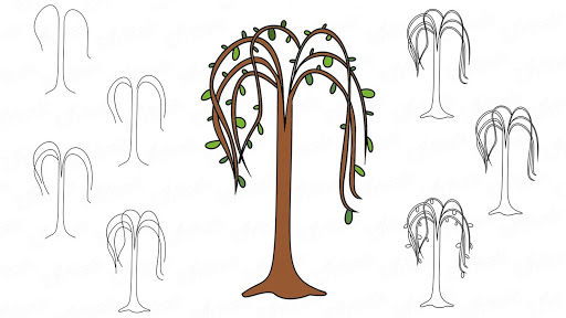 - Клоните са изрисувани отгоре надолу в плавна дъга, като се завъртат в две противоположни посоки от ствола.