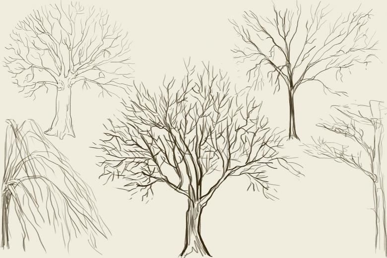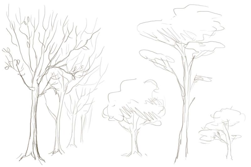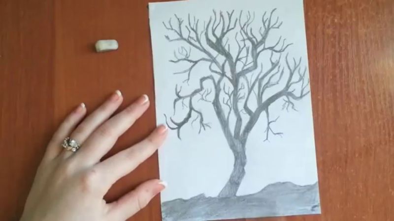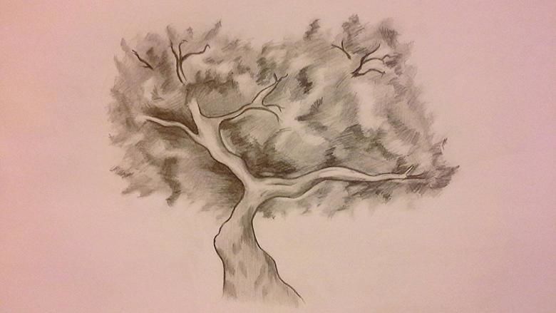 - За очертаване на клоните в основата на ствола трябва да се използва по-мек молив и по-силен натиск. По същия начин там, където има празнини, листата и клоните трябва да се очертаят с по-силен натиск на молива.