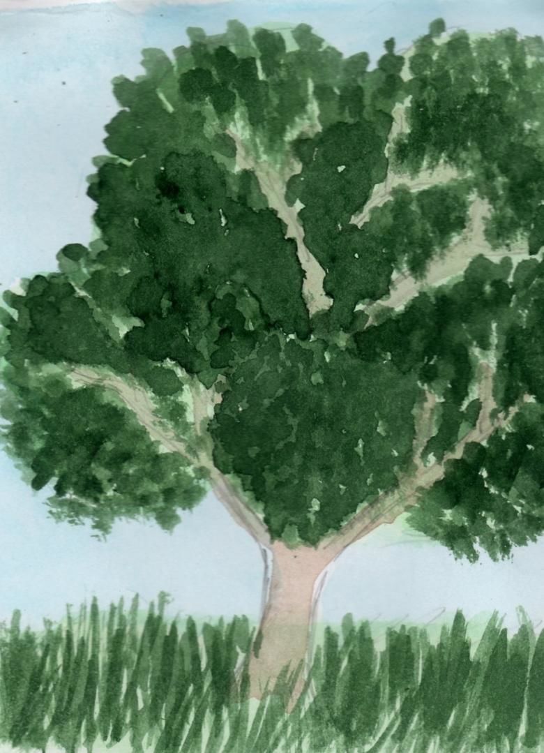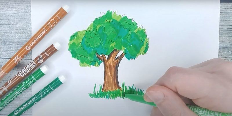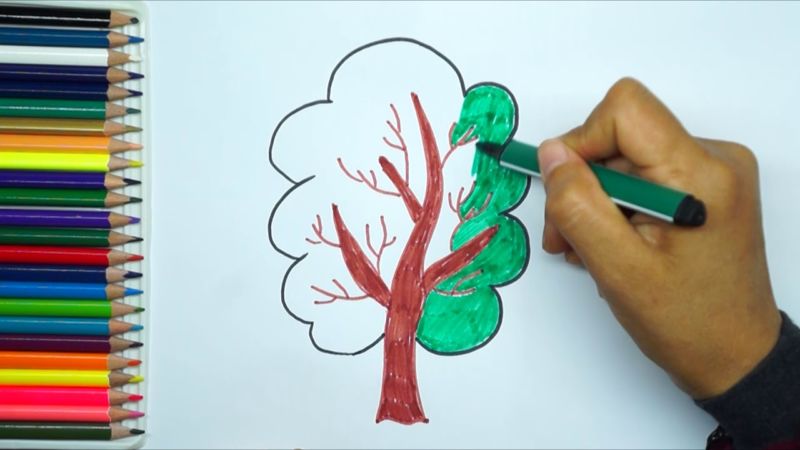 - С леки и резки движения се рисува короната на дървото. Тя се рисува с асиметрични щрихи, доколкото е възможно, не е необходимо да ги изтегляте, за да изглежда короната естествена.