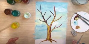 - Около дървото можете да създадете среда. Например, под земята нарисувайте падналите листа в оранжево и жълто, дори можете да използвате червеникави нюанси. Зад красиво оцветеното дърво с неговите фини детайли можете да нарисувате сиво-син фон - небето.