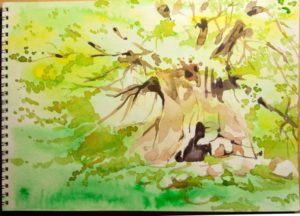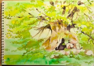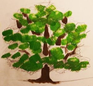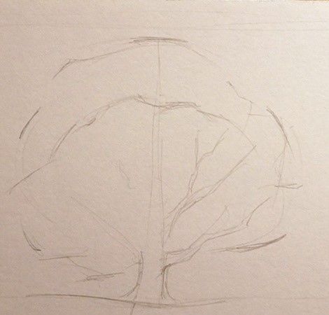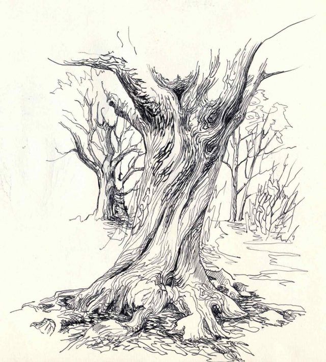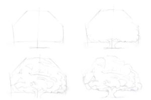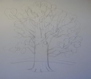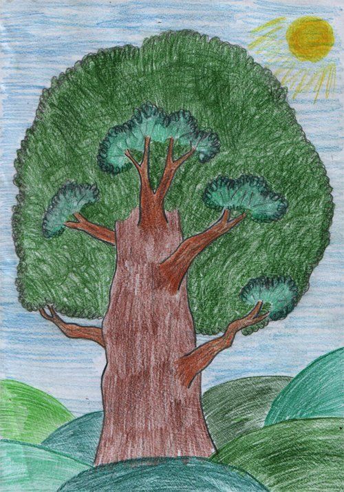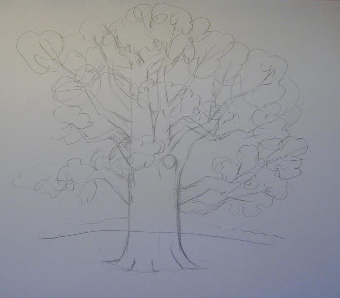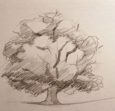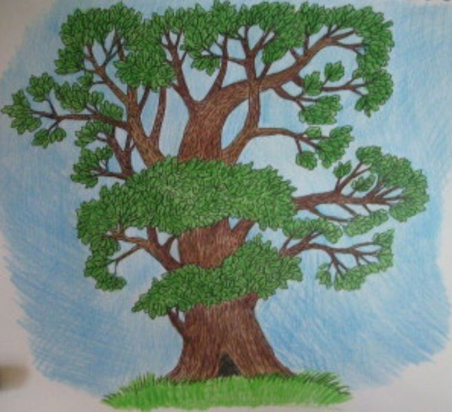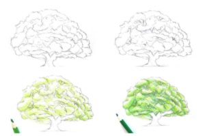 - След това разграничаваме самата корона. С къдрави щрихи се рисуват области от зеленина. Не забравяйте, че дървото не трябва да има идеална форма.