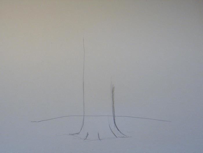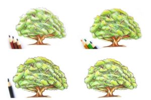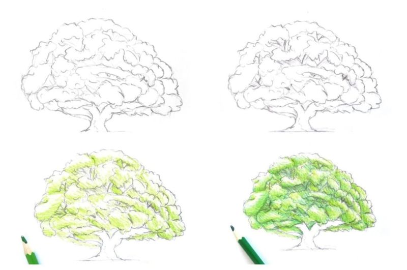 - Клоните, разположени по-близо до короната, са с тъмнокафяв оттенък. За да получите по-тъмен цвят, трябва да натиснете по-силно молива. Стволът е светъл откъм светлата страна и по-тъмен от другата страна.