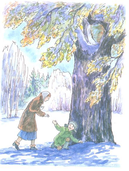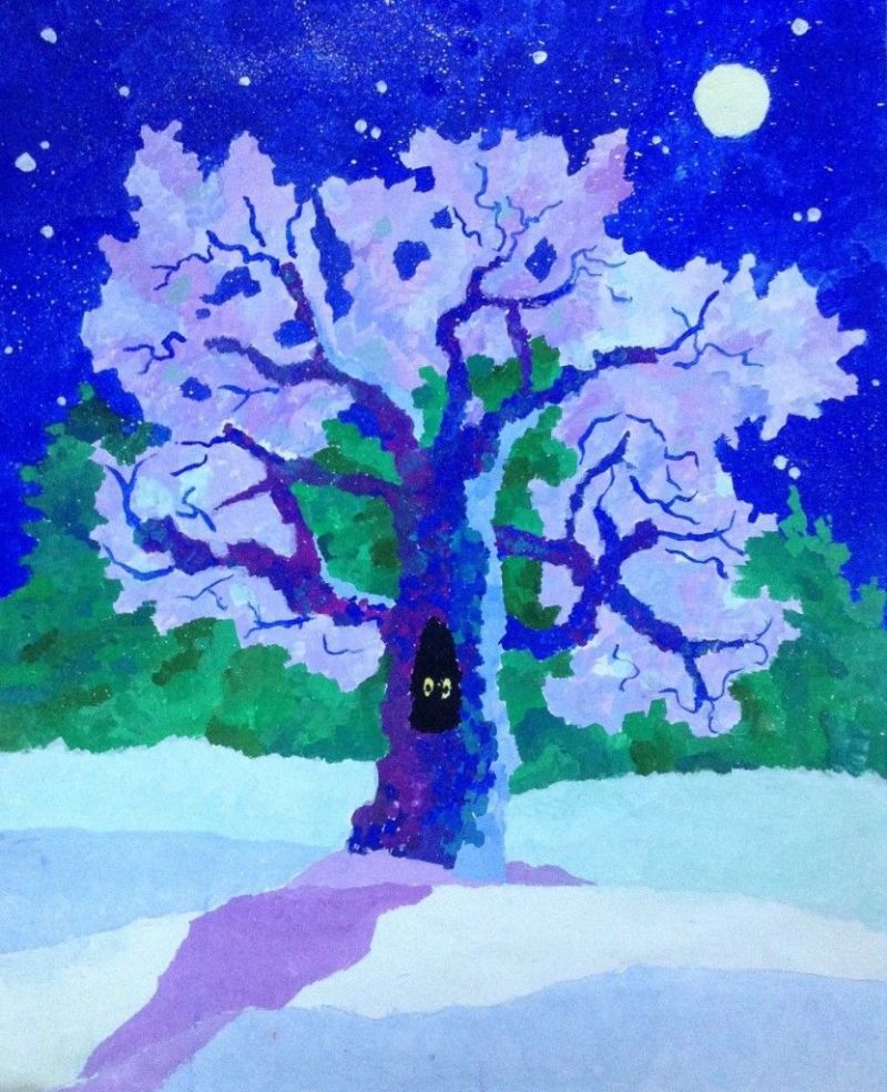 За да покажете дъб в период на снеговалеж, можете да използвате синкави и сини нюанси, за да обозначите снега по клоните. Между другото, дъбовите листа не падат дълго време и понякога остават по клоните през цялата зима.