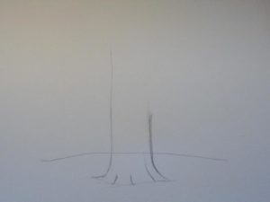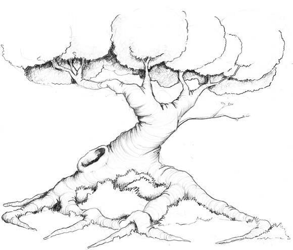 - Действие 9. За да заприлича повече на истинско дърво, нарисувайте около това растение силни корени, които стърчат на някои места.