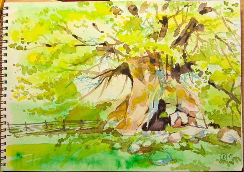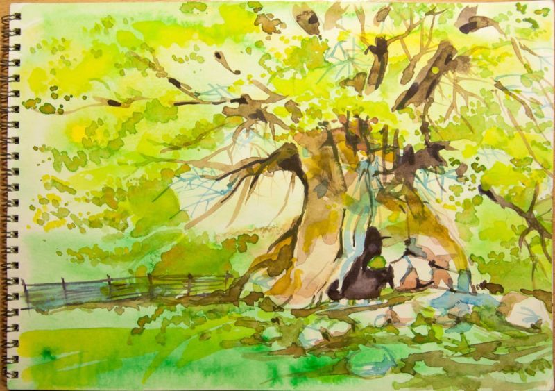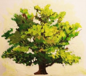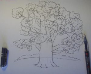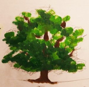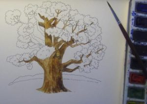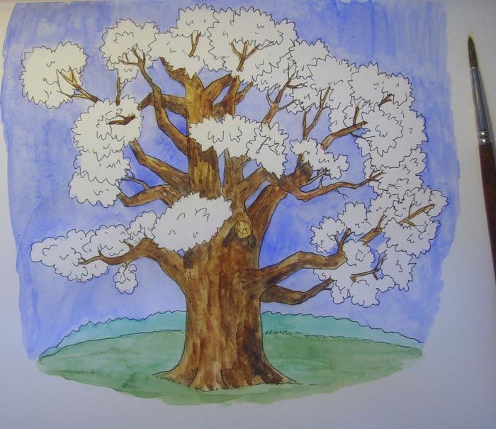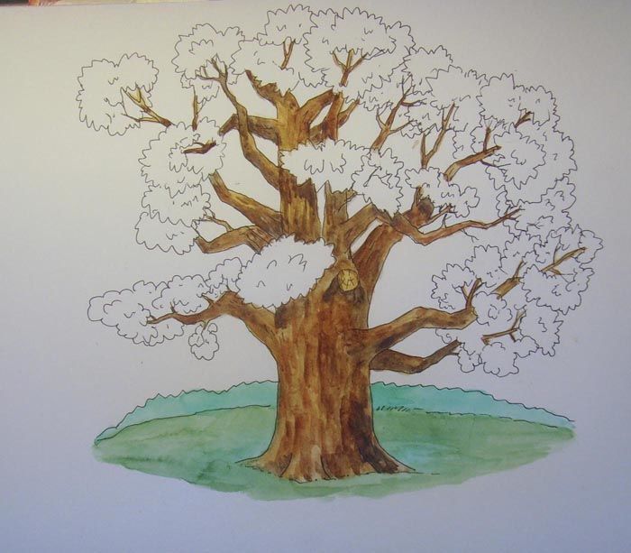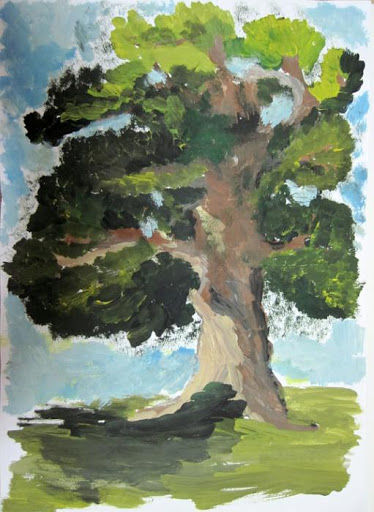 Накрая остава само да очертаете някои контури на зелените цветове и ствола, за да ги подчертаете. И воала! Вашият могъщ, боядисан дъб е готов.