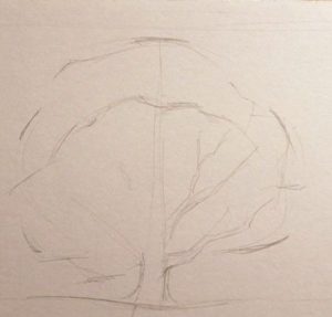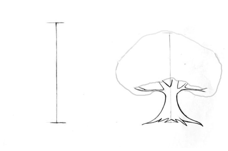 - Първото нещо, с което започваме, е конструкцията. Вземаме лист хартия и под средата му отбелязваме линията на хоризонта, а също така отбелязваме центъра на дървото. Самата форма трябва да бъде разпределена. Затова не трябва да прилича на топка или правоъгълник.