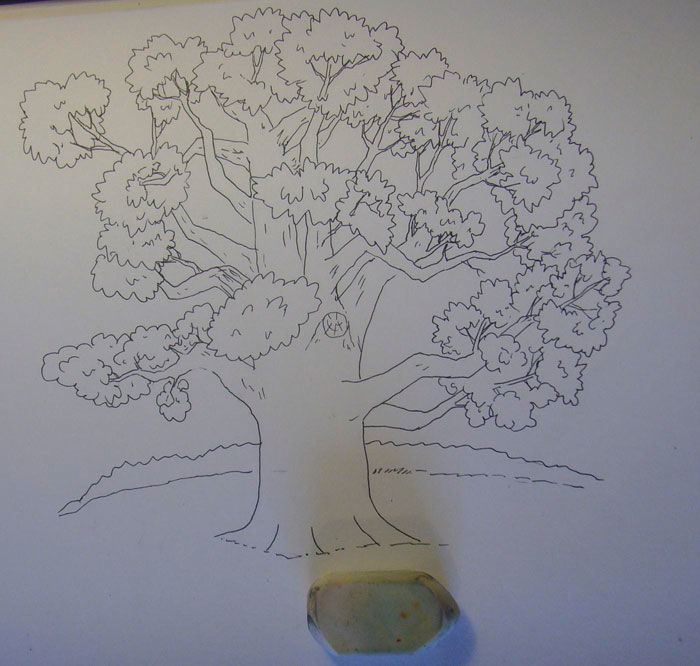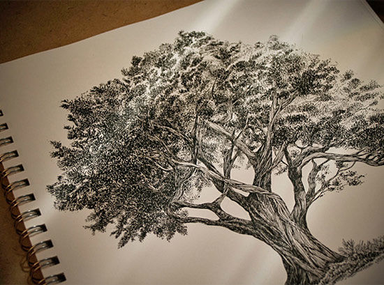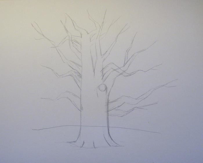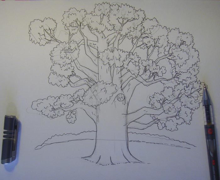 - На този етап от работата с молива всъщност сме приключили. Сега можем да проследим някои детайли на дъба по-точно. Някъде можем да очертаем ясни контури, а някъде - не толкова ясни. Също така по ствола на дървото трябва да добавим няколко линии, бръчки, за да заприлича на истинска дъбова кора.