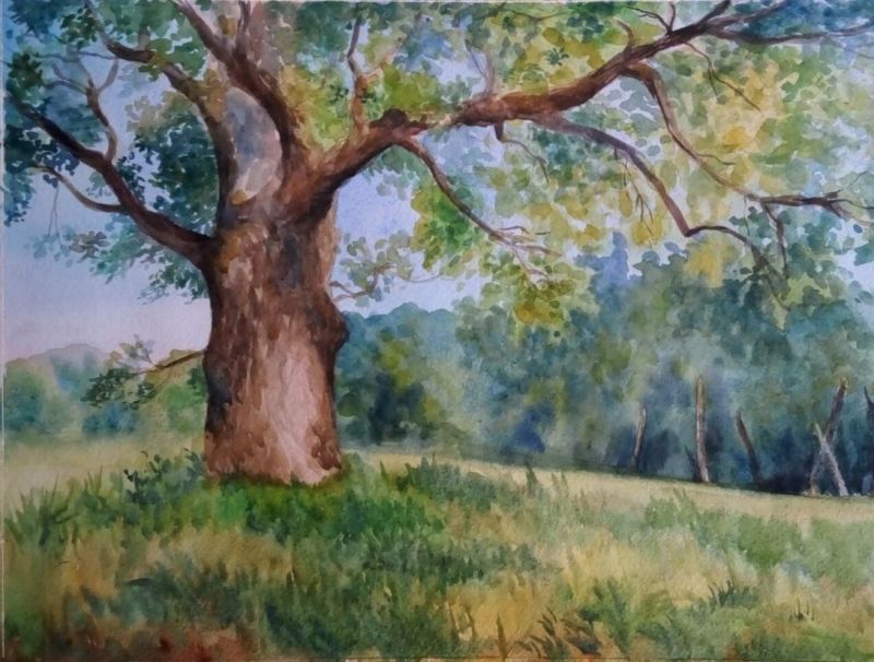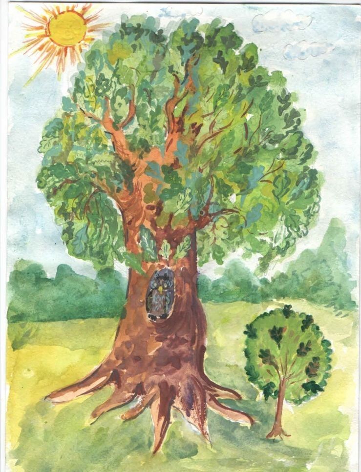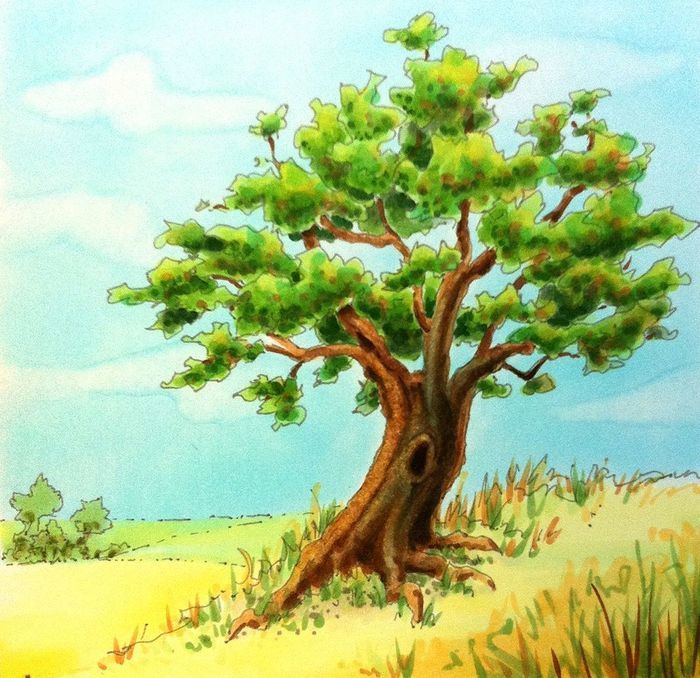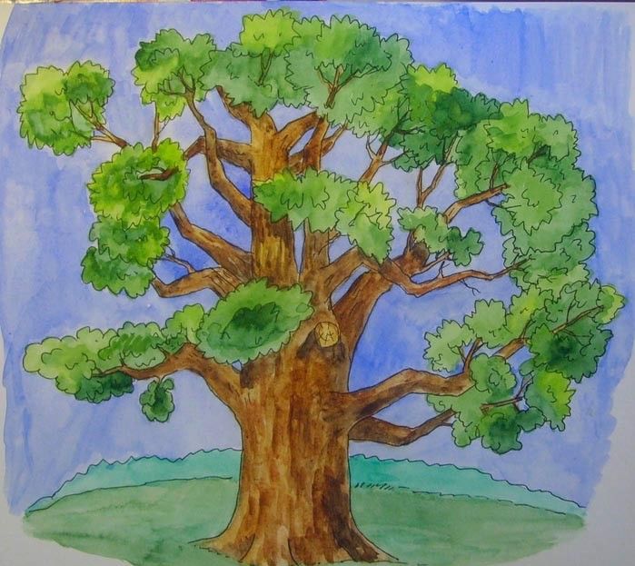 - Действие 8. Помислете какво ще бъде изобразено на фона на вашия дъб? Това може да е цветна поляна, гора, планина, село или град - всичко зависи от вас. Нарисувайте подробно фона.