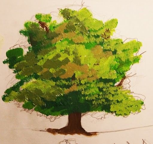 - Сега добавяме по-тъмно зелено към палитрата и ще боядисаме страната, която е по-в сянка. След това трябва да използваме още по-тъмно зелено и да боядисаме пространството между клоните по-близо до ствола. Със същия цвят можем да придадем сянка и на листата по цялата корона.