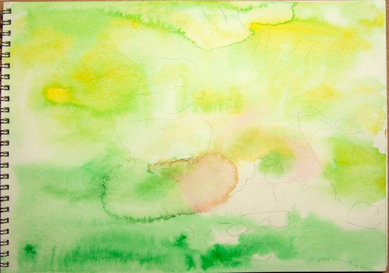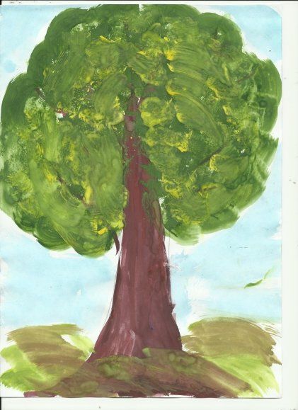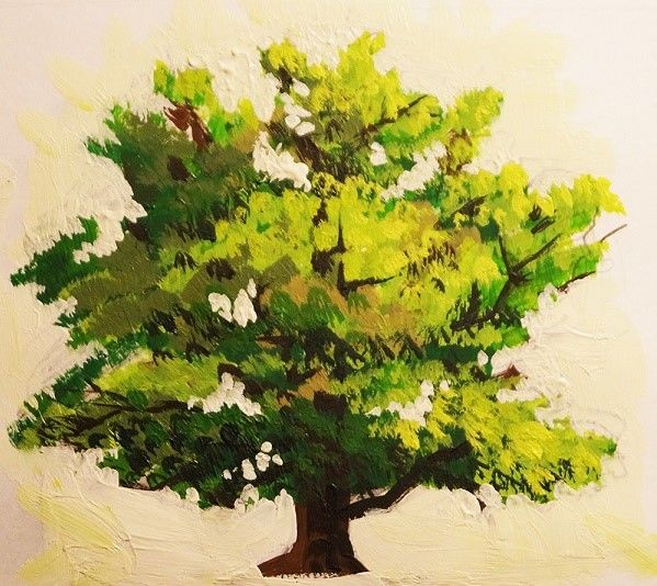 - След това ще нарисуваме нашата картина. Ще започнем с короната, отначало ще използваме жълта боя, а след това бавно ще добавяме зелена. Това е необходимо, за да може дървото да изглежда обемно и сякаш светещо. Широките маски са над горната част на дъба и малко встрани (спрямо слънчевата светлина). След това добавяме малко зелено към жълтата палитра и го нанасяме върху хартията. Желателно е да го нанесете в съседни на жълтия участъци, които дори леко да се смесват. Трябва да оставите някъде бели пролуки и дупки, за да можете да видите светлината, небето, през короната.