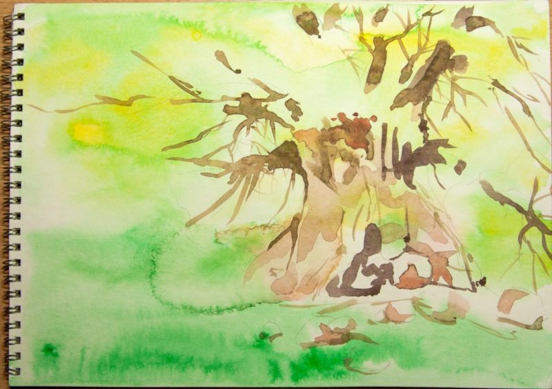 - Най-добре е дъбовите стволове и кората да се оцветяват по различни начини. Начертайте по-светли и по-тъмни жлебове върху гребена. По същия начин добавяте дълбочина и измерение на рисунката, като смесвате жълто и синьо. Когато листата са близо до стъблото, добавете зеленина.