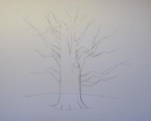 - Действие 3. Нарисувайте ствола на дървото. Кората на дъба е набръчкана и ъгловата, със забележими малки вдлъбнатини и обемни издутини, с възли. Нарисувайте тези характеристики върху чертежа си.
