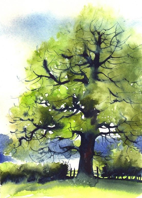 Така че вече знаем как да нарисуваме дъб. Започваме от принципа на ствола - обемен и мощен дъб. От него излизат много извити клони, които колкото са по-близо до краищата, толкова са по-тънки. След като построите скелета на дървото, попълнете го. Нарисувайте пищна зеленина.
