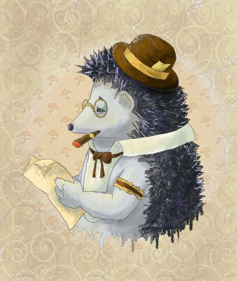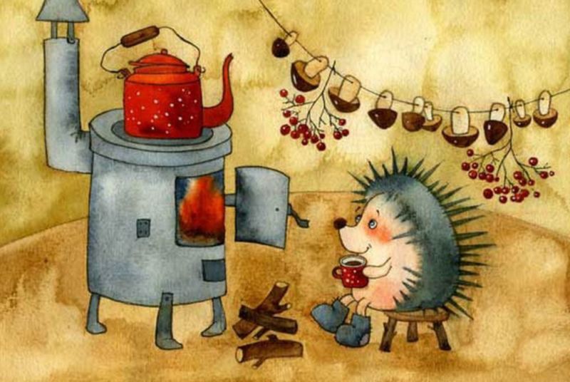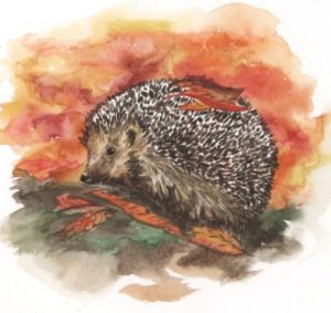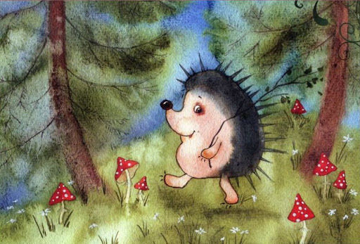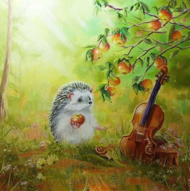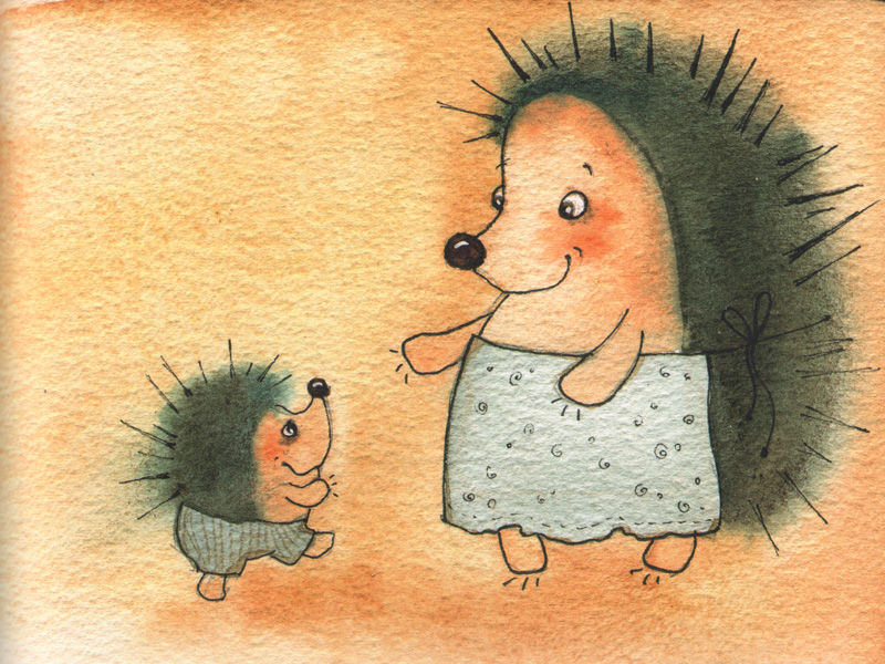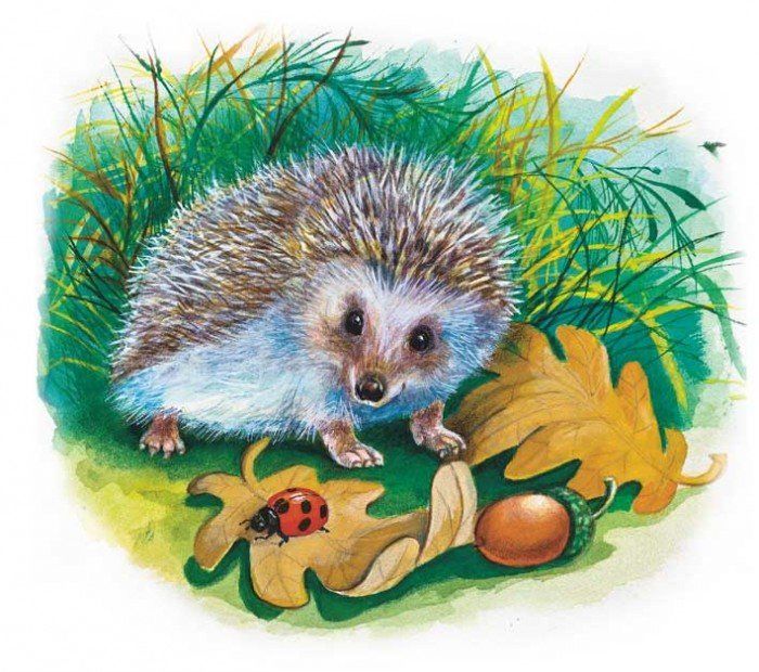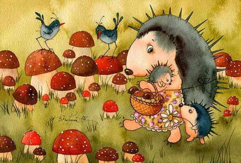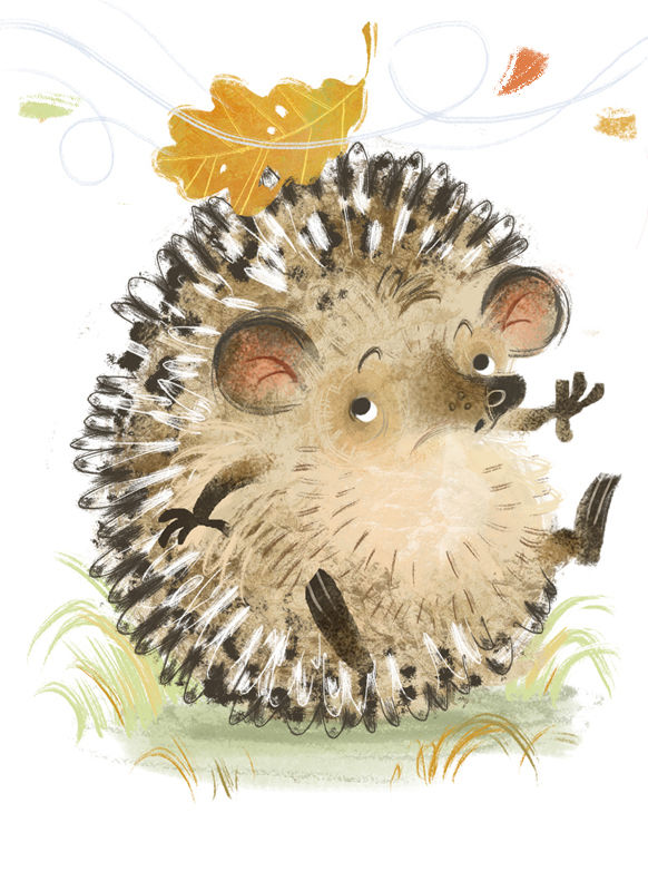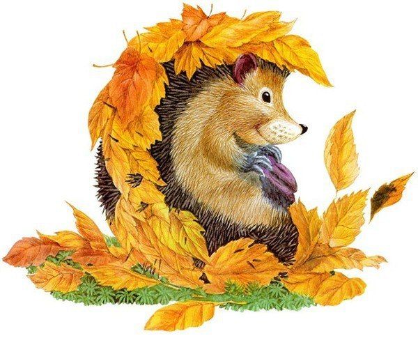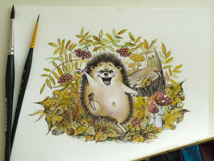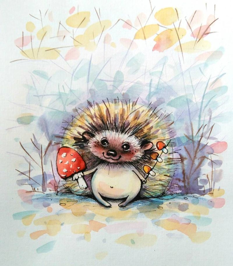 Таралежът е нарисуван. Приглушените пастелни нюанси позволяват да се предаде атмосферата на есенна гора.