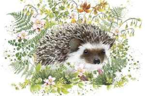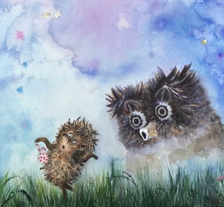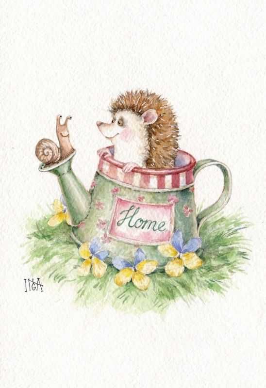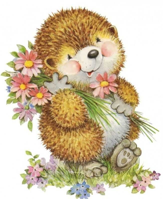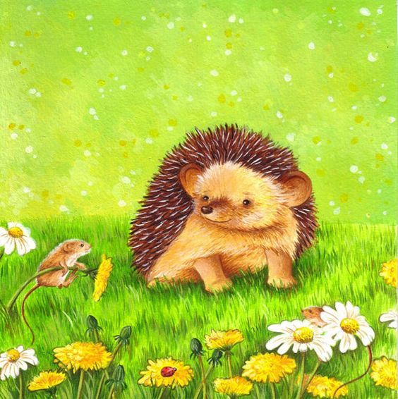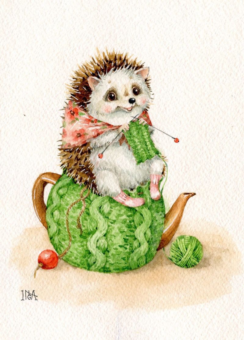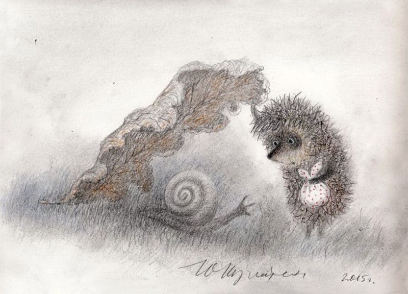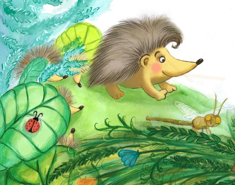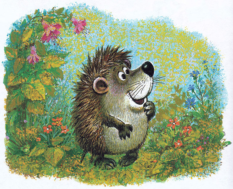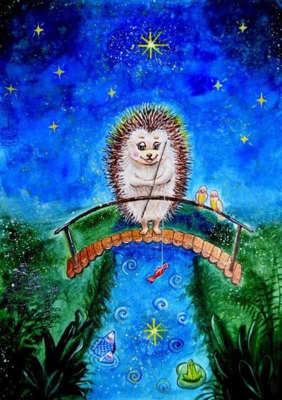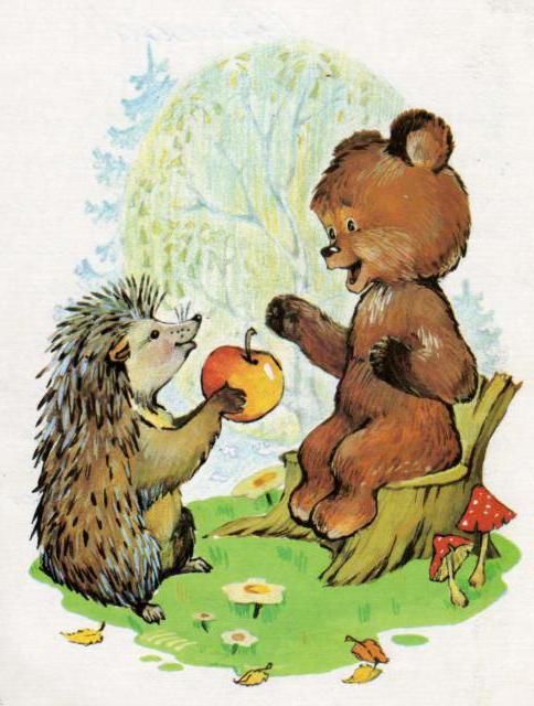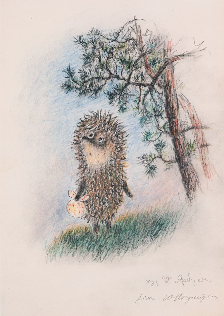 Таралежът е нарисуван. Приглушените пастелни нюанси позволяват да се предаде атмосферата на есенна гора.