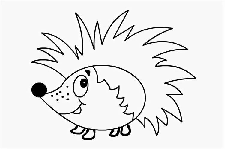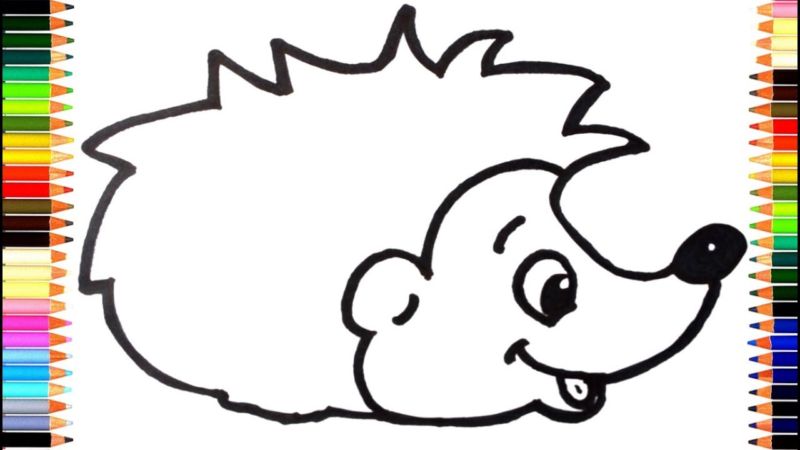 Нарисуван таралеж гледа от картината към художника. Сега таралежът може да бъде боядисан. Оцветете иглите в тъмнокафяво, краката, муцуната и корема в бежово, а очите, устата и носа в черно.