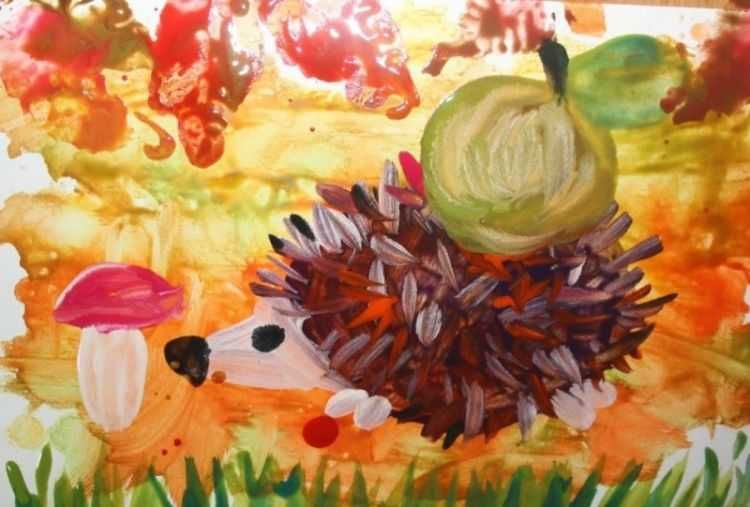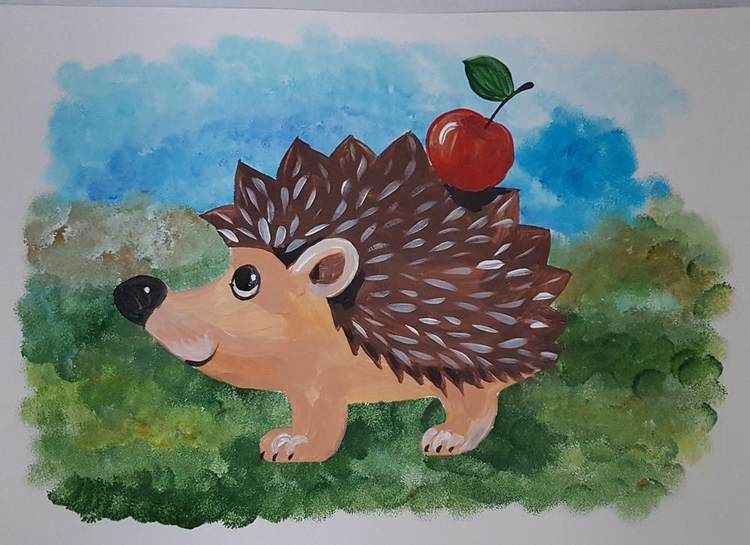 За да оживите изображението, можете да поставите ябълка на гърба на таралежа. Нарисувайте на земята трева, гъби и други възможни детайли.