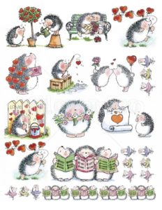 - Очертайте с черен флумастер и нарисувайте вежди. Попълнете с черно носа, устата и зениците. Кафяв торс и крака, сиви игли и засенчване. Очите са сини, а линията на устата - червена.