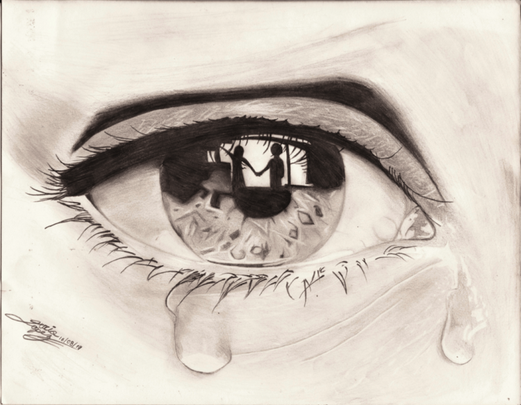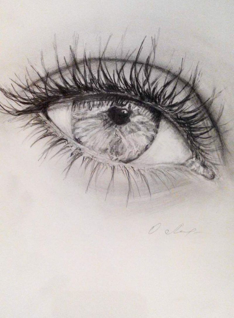 - Започваме със скица на нашата бъдеща картина. С помощта на леки линии с молив отбелязваме мястото, където ще се намира окото, във формата на капка, гънката на горния клепач, зеницата, отблясъка, слъзния канал във формата на зърно и веждата.