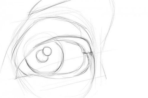 - На хартията има ирис, но сега трябва да нарисуваме зеницата и задължително да я осветим, за да придадем обем и реализъм на окото. Вътре в ириса начертаваме още един кръг, който леко докосва горния клепач, а вътре в зеницата - още един малък кръг - това ще бъде отблясъкът.