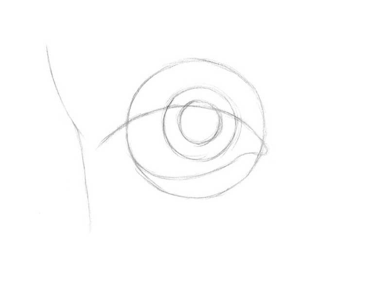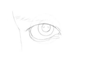 - Нека преминем към ириса, изобразяваме го под формата на кръг, погледнете отражението си и обърнете внимание, че когато окото е в отпуснато състояние - то не показва напълно очната ябълка, затова, рисувайки кръг за ириса, спрете на линията на горния клепач, не излизайте извън него. Под долния клепач е изобразена светла линия, така че клепачът изглежда дебел.