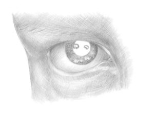 - Вземете остър син молив и леко очертайте ириса от ръба до зеницата, след което с обикновен молив нанесете плътно отпечатък върху зеницата, като оставите светлосенки за обем.