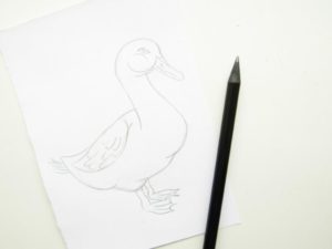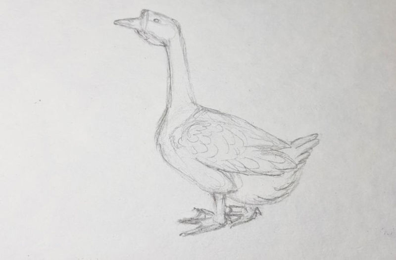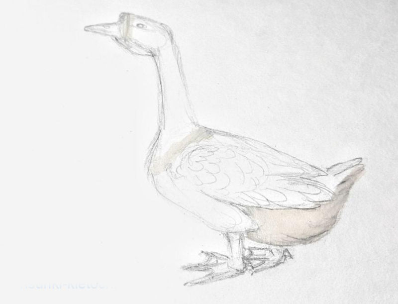 - Започнете да работите върху краката, ако рисувате гъска с молив, е важно да проследите фините детайли, като например паяжините на пръстите, ноздрите и т.н.