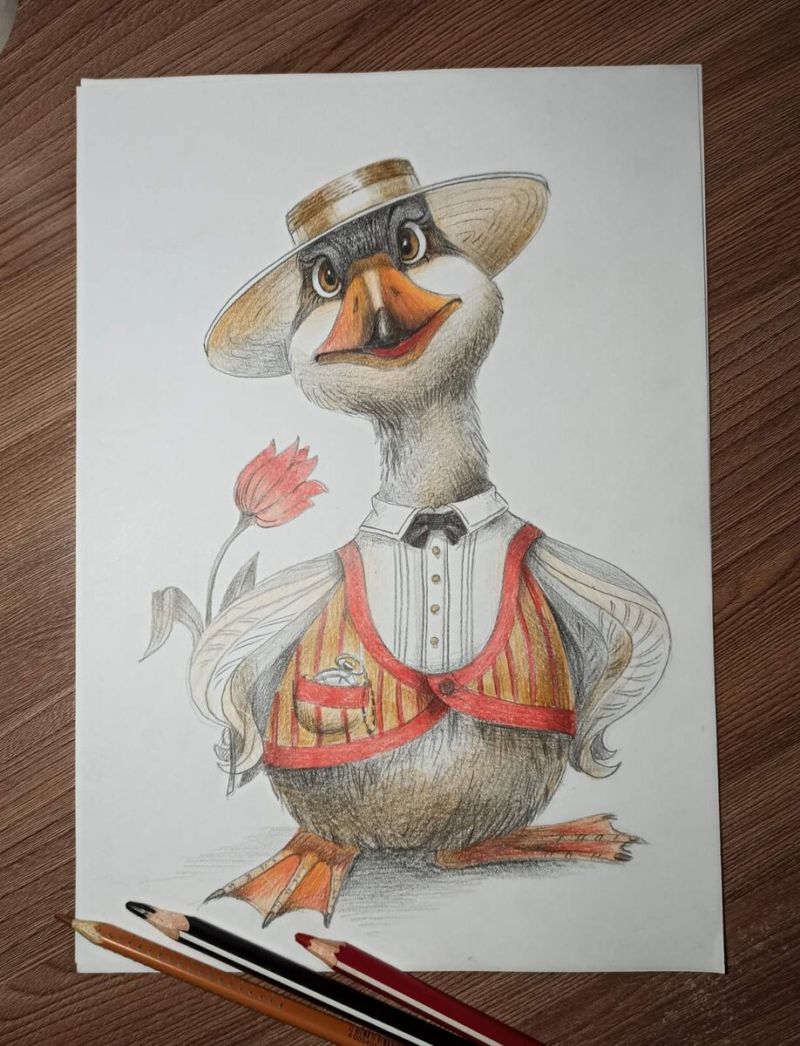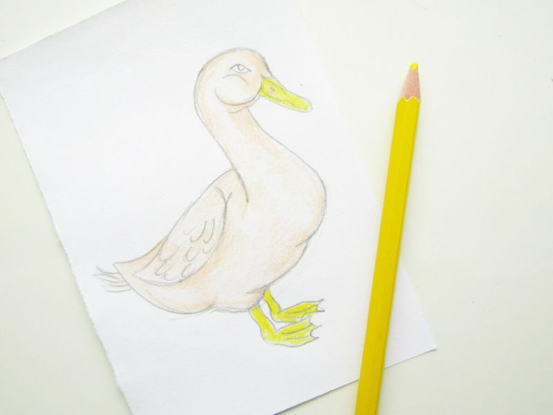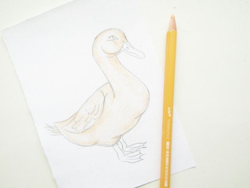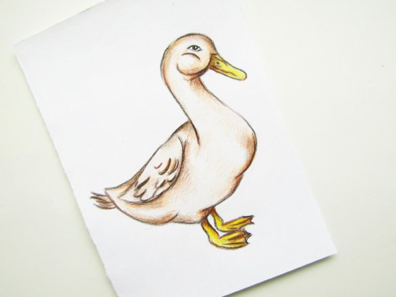 - Завършете, като нарисувате яката на дрехата на Доналд, и нарисувайте няколко гънки в областта на лактите и подмишниците, тъй като реалистичното пренасяне е много важно. Изработете човката и очите и оцветете гъската с цветни моливи.